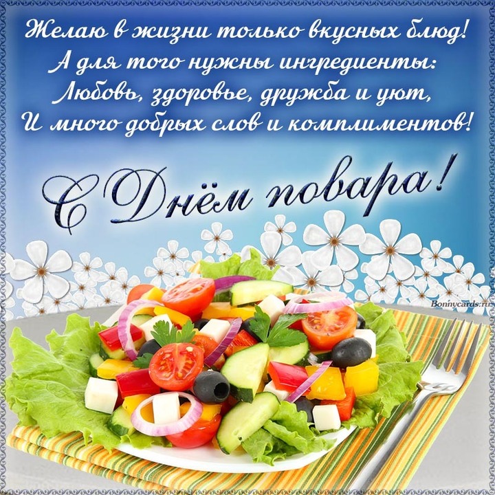 Поздравляем поваровДел вкуснейших мастеров!Приготовить блюдо вкусноЭто тоже ведь искусство. Открытки на День повара!