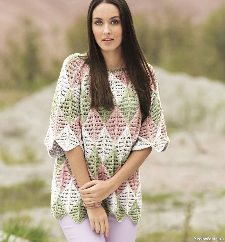 Трехцветный джемпер с узором из ромбов. Описание | Вязание для женщин спицами. Схемы вязания спицами Размер: 38/42 ВАМ ПОТРЕБУЕТСЯ Пряжа (100% органического хлопка; 125 м/50 г) — по 200 г зеленой, нежно-розовой и бежевой; спицы №3,5; круговые спицы №3,5. УЗОРЫ И СХЕМЫ РОМБ НА 31 ПЕТЛЮ Вязать согл. схеме 1. Каждый ромб начать с 1 изнаночного ряда и закончить...