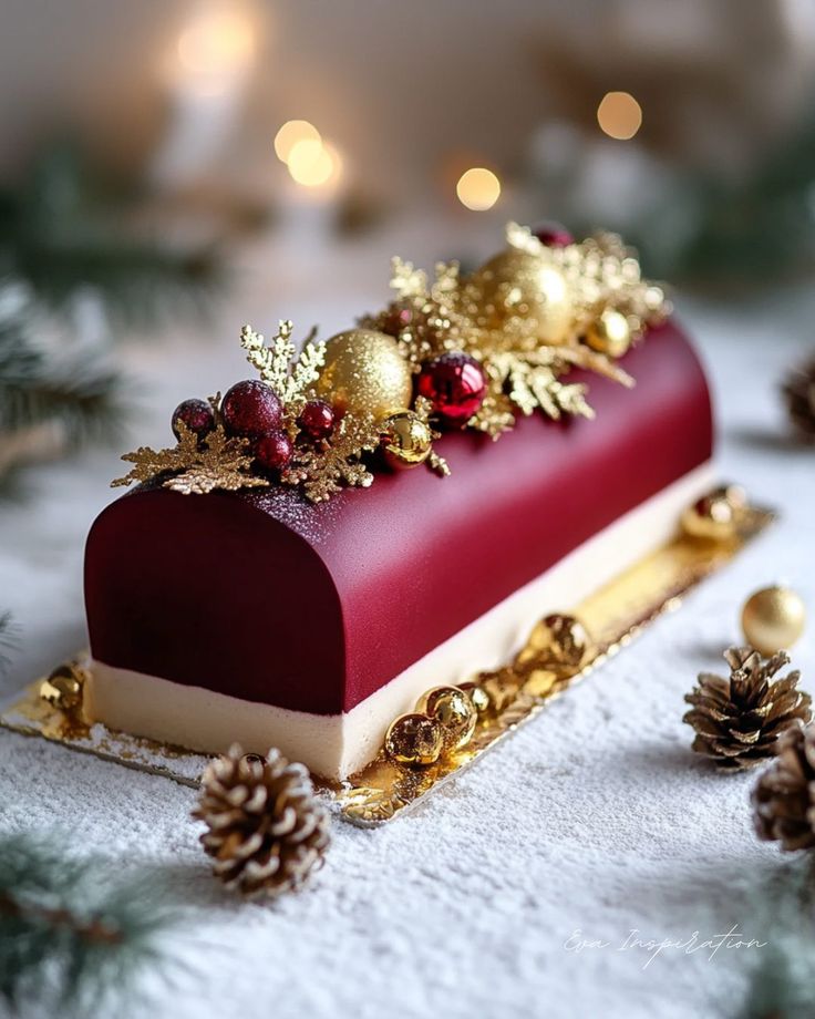 Bûche de Noël rouge mat et or – élégance festive et raffinée