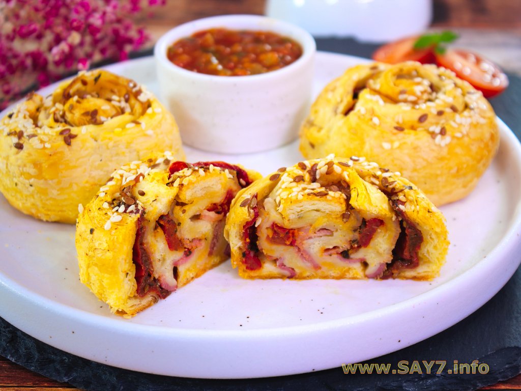 Рулетики из слоеного теста с вялеными томатами и беконом