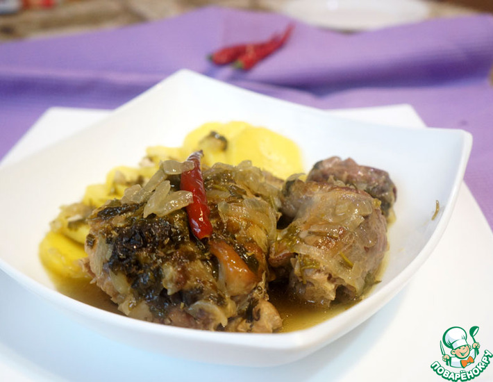 - Шею разобрать по суставам. Лук нарезать полукольцами или четвертинками. Зубчики чеснока нарезать пластинами. Листья кинзы порезать не слишком мелко. В сковороде разогреть растительное масло, обжарить голени до румянца. Так же поступить с шеей. Сложить все в казан или большую кастрюлю, посолить. В оставшийся в сковороде жир сложить лук и чеснок. Поджарить до легкой смены колера. Выложить лук и чеснок поверх мяса. Положить стручок перца целиком, накрыть все кинзой. Добавить розмарин. Налить воды (можно бульона, но у меня вода) так, чтобы она почти покрывала содержимое казана. Довести до кипения, убавить нагрев до малого и готовить под крышкой 2,5 часа. Подать с любым гарниром – у меня отварной картофель. Приятного аппетита!