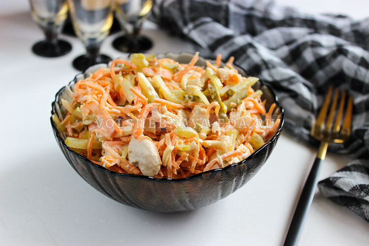 Салат «Лисичка» с корейской морковкой | Волшебная Eда.ру Закусочный салат «Лисичка» с корейской морковкой и курицей, с маринованными огурцами и сыром. Пошаговый рецепт с фото.