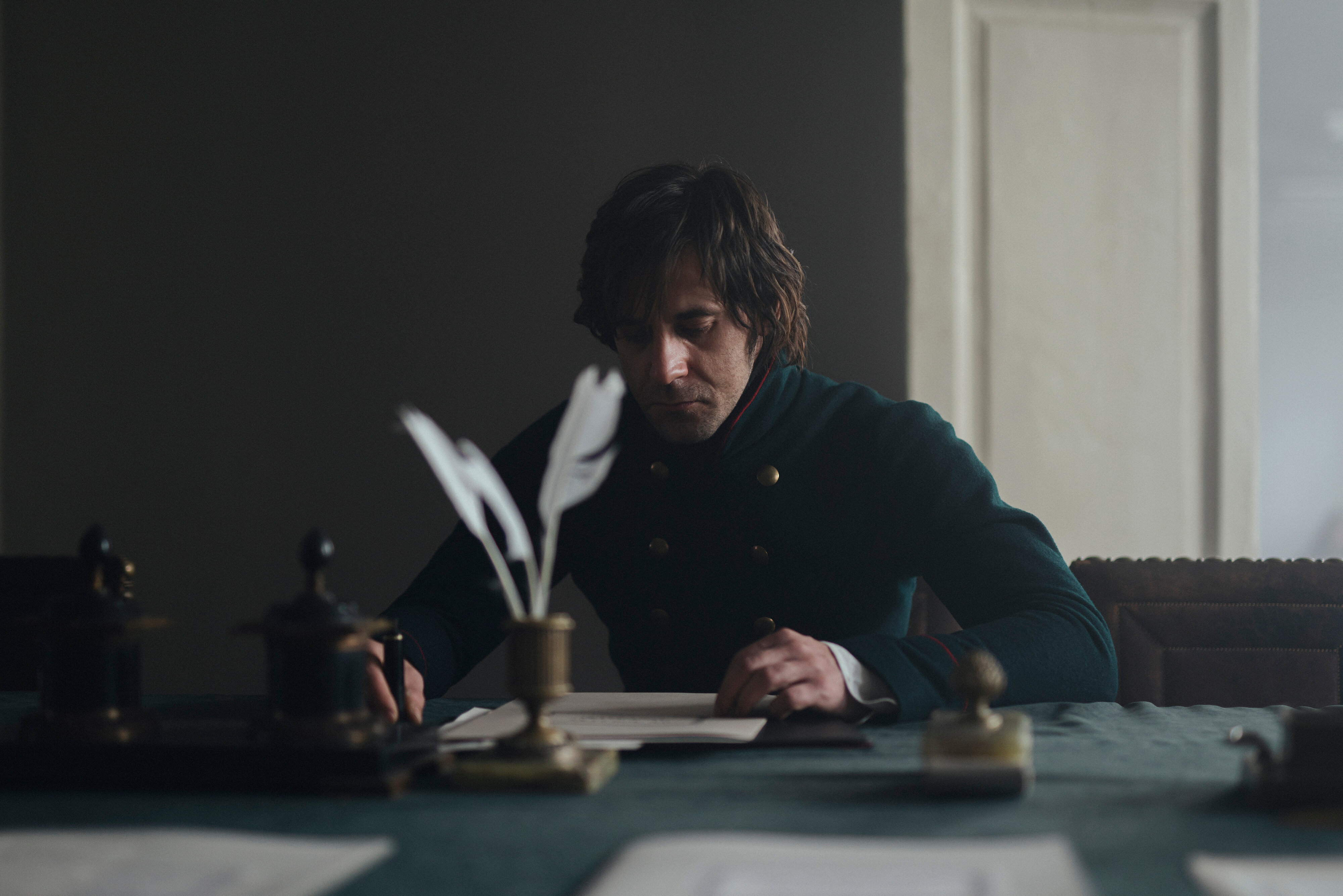 В полумраке старинного кабинета, под ритмичное царапанье пера о грубую фактуру бумаги, сидит человек, чей образ как будто сошёл с полотна романтического художника. Его строгий мундир крепко облегает плечи, а утомлённые глаза говорят о бессонных ночах и думе, тяжёлой, как исторические хроники. Он будто сам участник драмы, разворачивающейся на сумрачной сцене, где стены хранят шёпот и тайны всех прошедших здесь судеб. Кабинет окутан полутьмой, тонущей в ароматах прошлых эпох. Словно навеянный тенью тысячелетий, герой склонён над столом, выцарапывая у времени мгновенье истины, неуловимое, как росчерк пера. Кажется, словно слова, только что записанные им, превратятся в вены истории, легко касаясь рамок вечности и вдохновляя нового наблюдателя стать её частью.