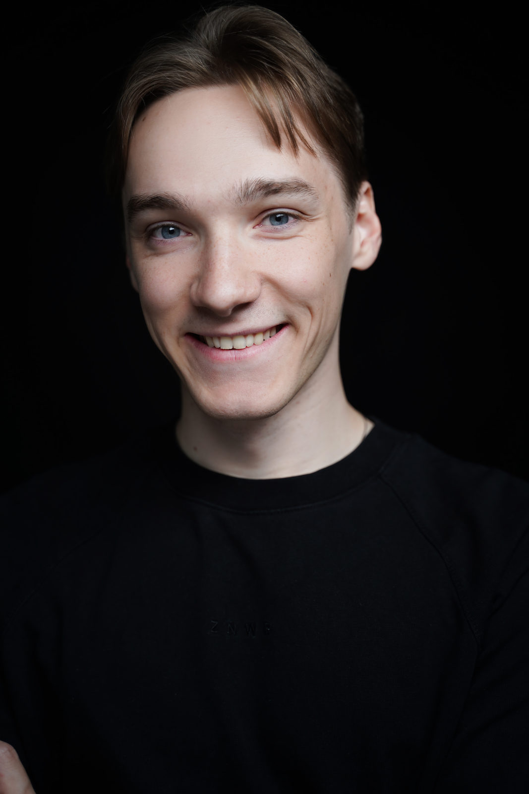 Тёмный фон обволакивает молодого человека в чёрной толстовке, создавая иллюзию, что он плавает в бескрайних просторах космоса, или, быть может, растворяется в тенях собственных мечтаний. Его лицо освещено мягким светом, который, как лунный свет в полнолуние, деликатно увивает черты, придавая гармонию и спокойствие. Глаза искрятся живым огнём, словно две звёздочки на горизонте. На губах играет лёгкая, едва заметная улыбка — как если бы он вспомнил что-то далекое и теплое, возможно, детское. Это выражение говорит о внутреннем мире, о стремлениях и надеждах, о которых знает лишь он сам. Тихий голос из-за кадра шепчет что-то о мечтах, сокрытых за горизонтом реальности, о перспективах, что возникают на границе света и тени, и непременном счастье, спрятанном в каждом искреннем взгляде. Восходящее утро ещё едва различимо на фоне его лица, в то время как панорама мира недосягаемо тянется за пределами видимого.