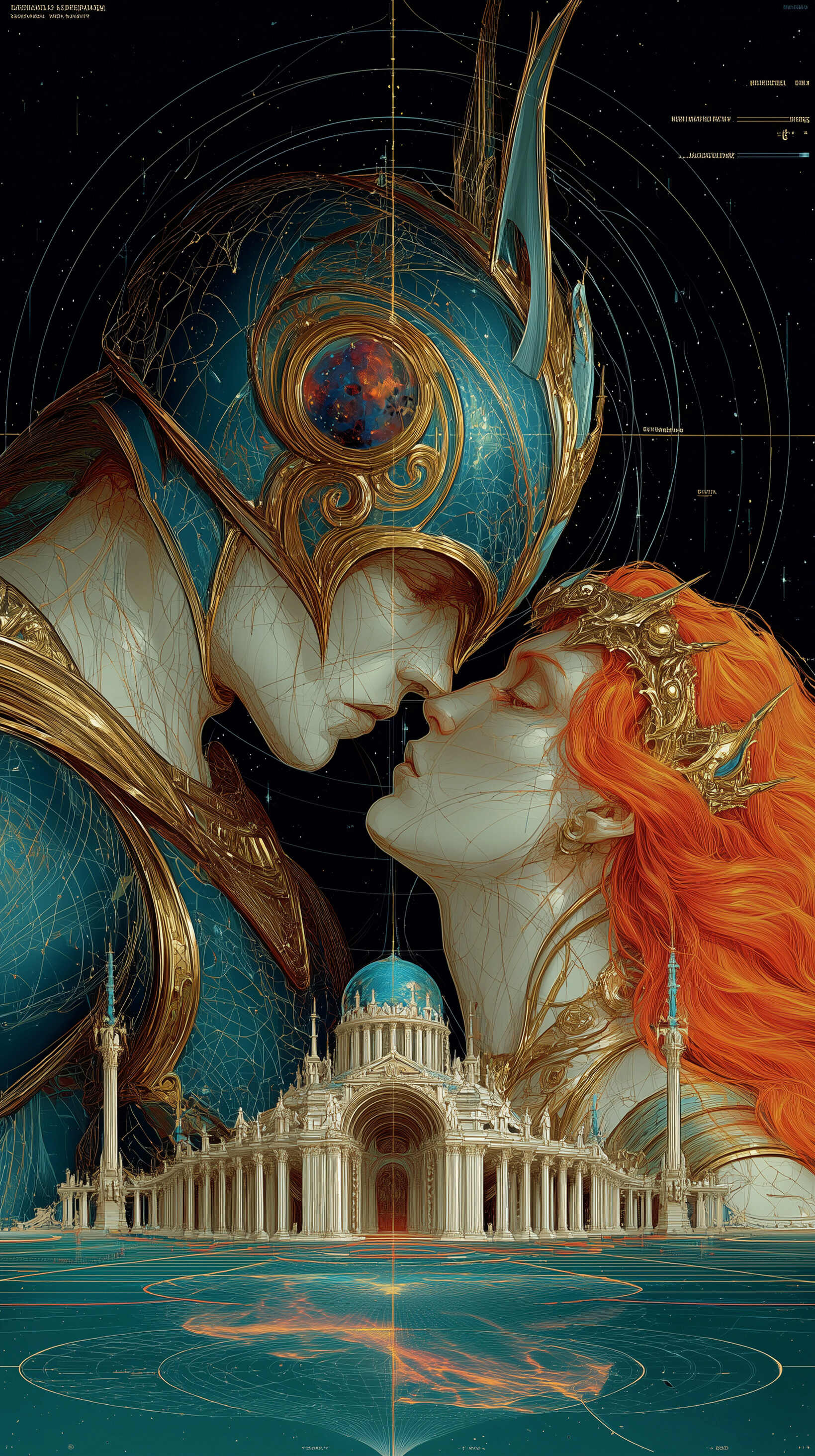 В глубинах космической ночи, среди мифических орбит и световых теней, они замерли навеки — рыцарь в шлеме, украшенном звёздными узорами, и алое чудо, воплотившее силу огня. Их лица, как два магнита, близки к соприкосновению, притягиваясь и отражаясь на фоне грандиозного неоклассического храма, чьи колонны бесконечно устремляются в лазурное поле. Он — хранитель звёздной стражи, она — королева огня, их связь неразрывна как история самой вселенной. Под ними - гордость архитекторов эпох, дворец, что мечтает подняться до самых небес, взывая к душам, затерянным в вечности. Архитектурная геометрия передаёт аккорды вечности, а тонкие линии шлема и волос рвутся ввысь, как хотят взлететь мечты, запертые в тяжёлых оболочках человеческих ожиданий. Этот союз, загадочный и грандиозный, говорит о немыслимом балансе между реальностью и магией, истории и фантазиями, которые перетекают друг в друга подобно великому космическому танцу.