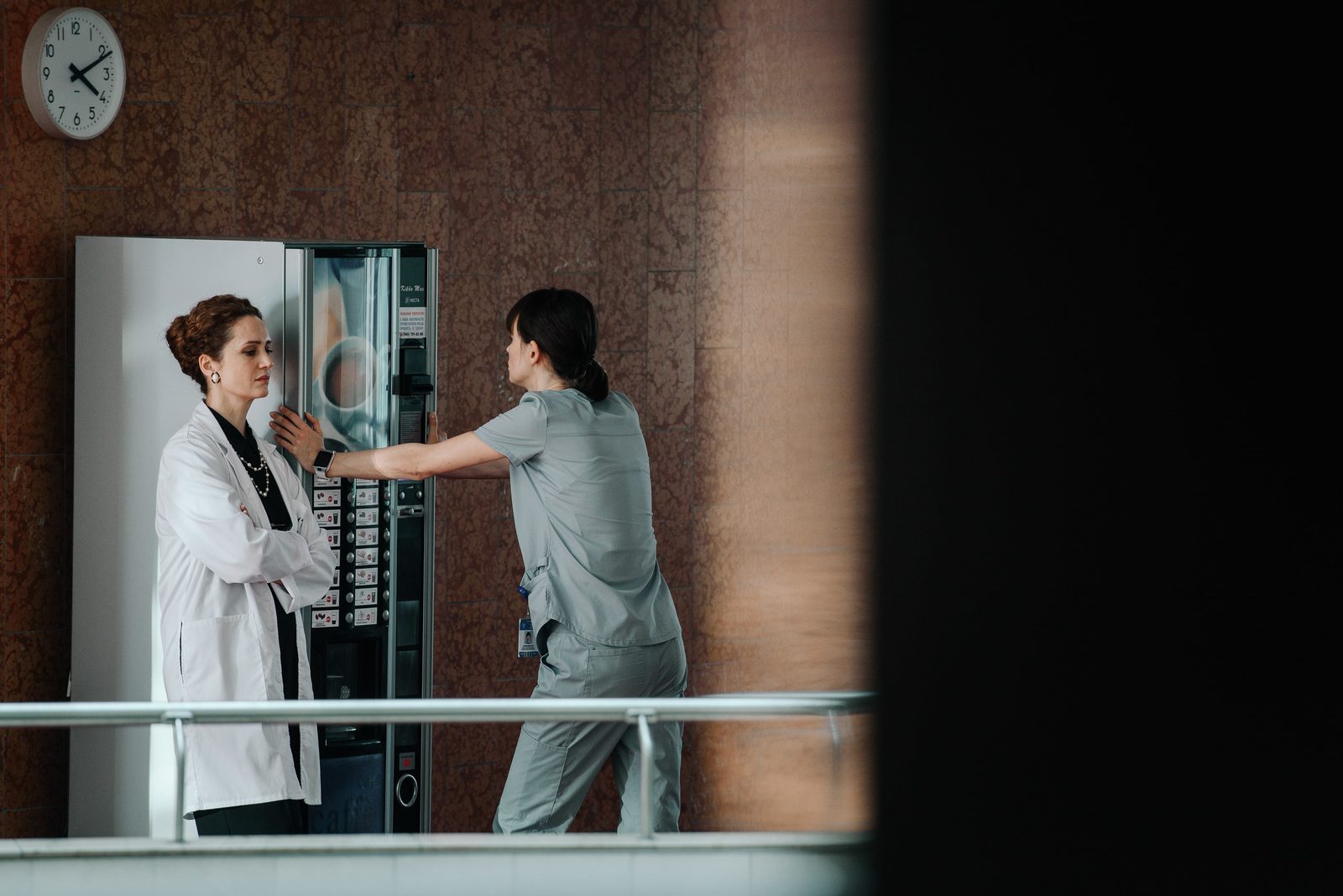 Лабиринт коридоров больницы тихо переговаривается между собой звуками шагов и шорохами белых халатов. На переднем плане — встреча двух миров у автомата с напитками, иллюстрация напряжения как в чеховском рассказе, где каждый жест говорит о большем, чем словами можно выразить. Врач, как из классической мелодрамы, скрестив руки, воплощает спокойствие и уверенность, будто весь мир замер на миг перед её собранным взглядом. Второе действующее лицо — медсестра без устали тянется к машинам этого причудливого механического эстета, как Эол к ветрам. Часы на стене, безмолвные и равнодушные как вечность, отсчитывают тихие секунды этой бесконечной повседневности, где каждое мгновение — это маленькое колесо в колоссальном механизме заботы о здоровье. А родной, почти фамильярный шёпот надписи становится голосом времени, зовущим к бытию.
