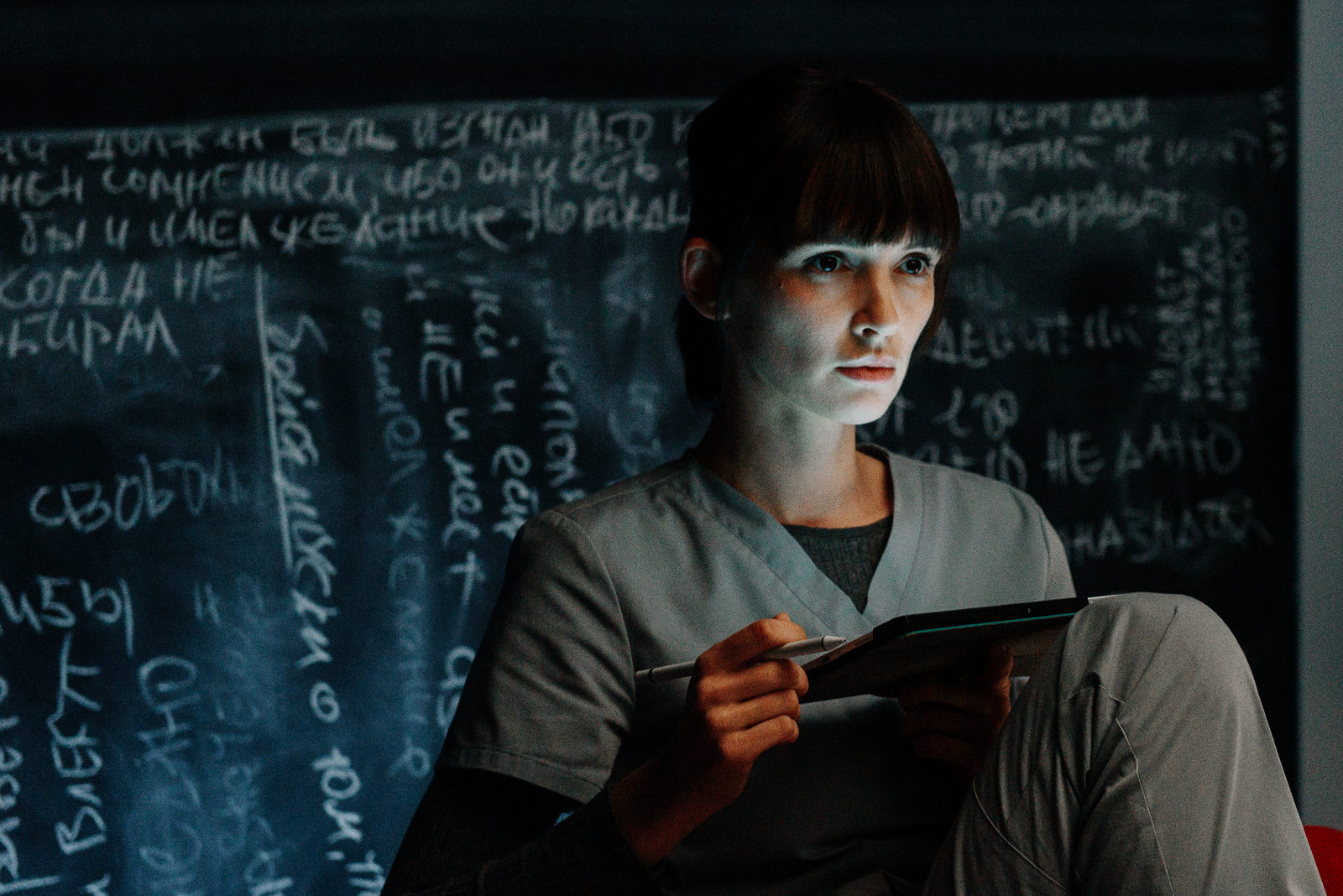 В сумеречном полумраке, словно внутри загадочного романа, женщина, одетая в медицинскую форму, погружена в свой немой разговор с цифровым окном в мир, который держит её в плену данных и гипотез. Свет экрана обрисовывает её лицо странным сиянием, как ангела, охраняющего тайны хроник человеческой жизни. За её спиной — доска, покрытая текстом, как древние свитки, где истины и призраки прошлого сошлись в бесконечном споре. Каждая строка на спиной настенной доске как шёпот забытых голосов, запертых в этой комнате памяти. Этот момент, как будто вырванный из стихийного хаоса, на самом деле предвещает ритмы жизни и смерти, бьющиеся в такт технологического прогресса. Пронзительный свет экрана, освещая занавес прошлого, создаёт иллюзию надежды, оглашающей мир грез и искусств.