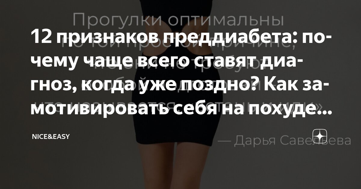 12 признаков преддиабета: почему чаще всего ставят диагноз, когда уже поздно? Как замотивировать себя на похудение и оздоровление Статья автора «Nice&Easy» в Дзене ✍: С отличной осенней субботой вас! Хоть у многих она и дождливая. Маленькая мотивация от Тренера – вспоминайте наши уроки по трансформирующей риторике.