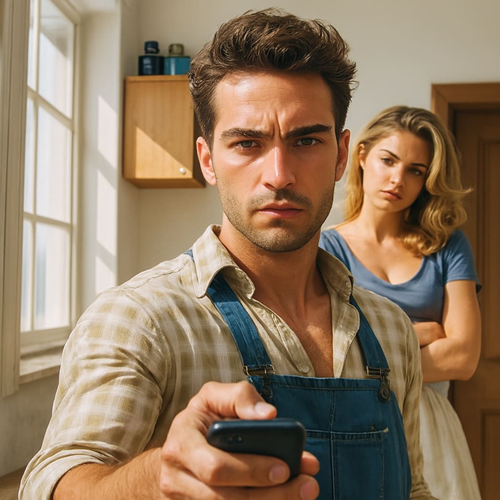 В свете утреннего солнца, пробивающегося сквозь широкое окно, молодой мужчина в джинсовом комбинезоне стоит с пультом в руках, словно дирижер в момент кульминации симфонии. Его взгляд сосредоточен и решителен, как будто он собирается изменить не только канал на телевизоре, но и всю свою жизнь. За его плечом, как тень или надежда, стоит женщина с золотыми волосами, скрестившая руки на груди. Её лицо выражает смесь легкой иронии и скрытой уверенности в том, что происходит. Только тишина комнаты и легкий шепот уличной жизни дают понять, что здесь разворачивается важный момент человеческой драмы. Эта сцена словно кадр из фильма об отношениях, где каждая деталь имеет значение: свет играет на волосах, создавая золотой ореол, а пыльца времени мягко оседает на подоконнике, напоминая о неподвластной времени мудрости.