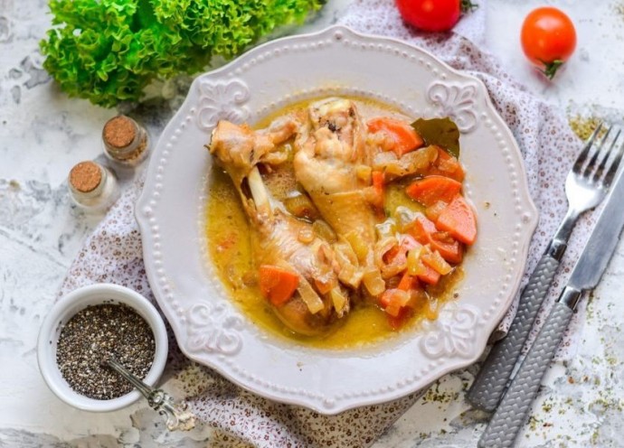 Курица, тушеная с овощами в банке Ингредиенты:Курица — 400 гМорковь — 100 г Лук — 100 г Лавровый лист — 2 шт. Перец горошком — 5 шт.
