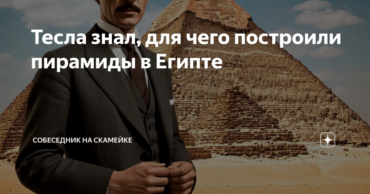Тесла знал, для чего построили пирамиды в Египте Статья автора «Собеседник на скамейке» в Дзене ✍: В школьных учебниках написано, что египетские пирамиды были построены древними египтянами для захоронения древних египетских правителей.
