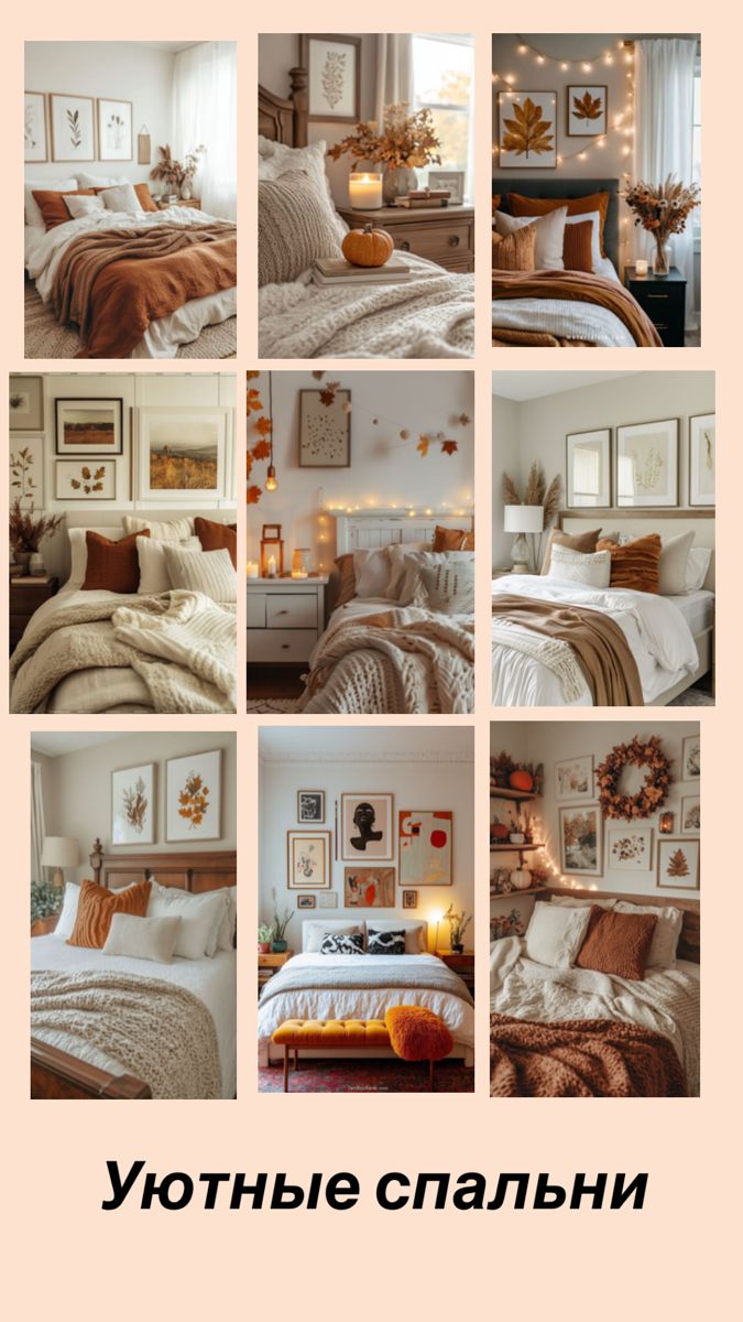 9 уютных спален с кроватями, подушками, одеялами и декором. Стены украшены картинами и гирляндами.