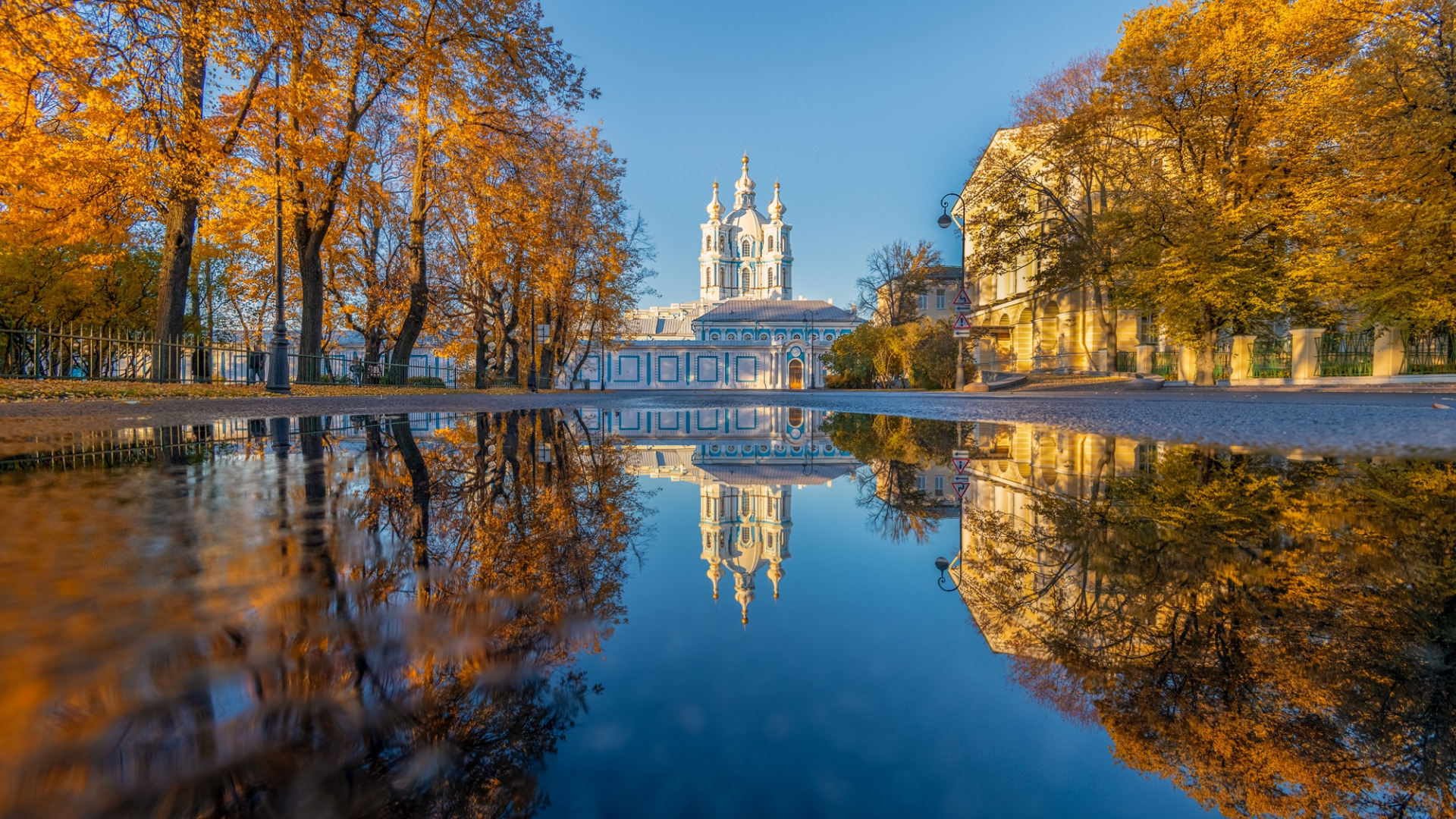 Скачать обои осень, деревья, отражение, лужа, Санкт-Петербург, храм, Россия, Смольный собор, раздел город в разрешении 1920x1080