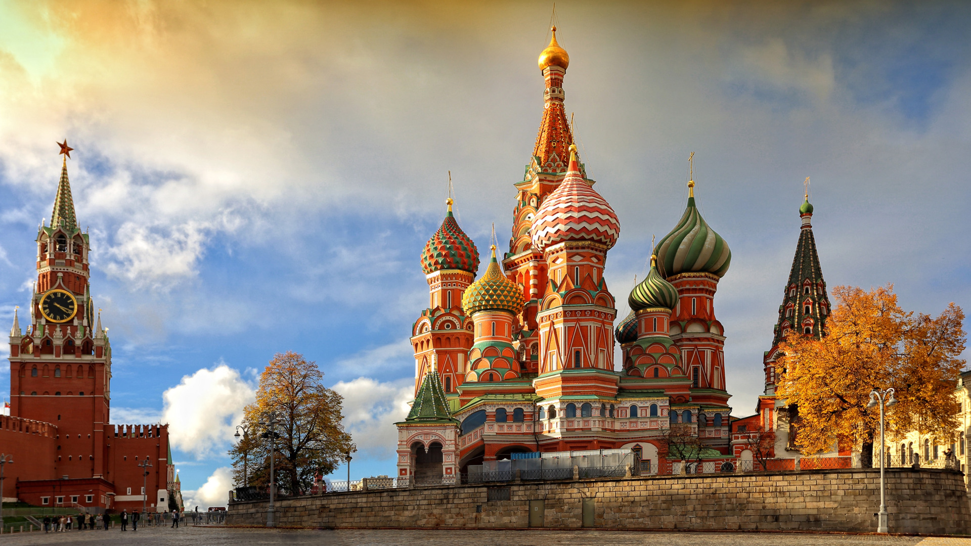 Скачать обои осень, башня, Москва, собор, храм, Храм Василия Блаженного, Россия, Спасская башня, раздел город в разрешении 1920x1080
