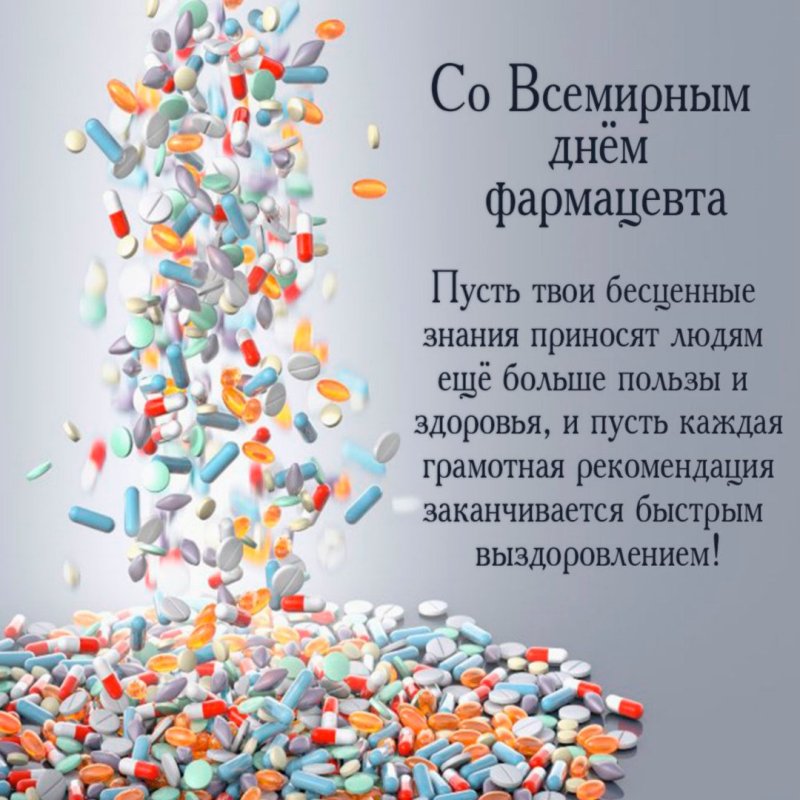 Пусть даже самый сложный день будет «без побочных эффектов», а настроение — стойким к стрессам! Спасибо, что помогаете людям чувствовать себя лучше. Радости, вдохновения и крепкого здоровья! Открытки на День фармацевта.