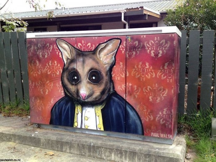 Оклендские зверушки Пола Уолша (Paul Walsh) Новозеландский уличный художник Пол Уолш (Paul Walsh), родился и вырос в Окленде. Ему же автор и уделяет больше всего внимания в своем творчестве. Так, Пол превратил пятнадцать унылых телефонных коробок с коммуникациями в очень оригинальные холсты.