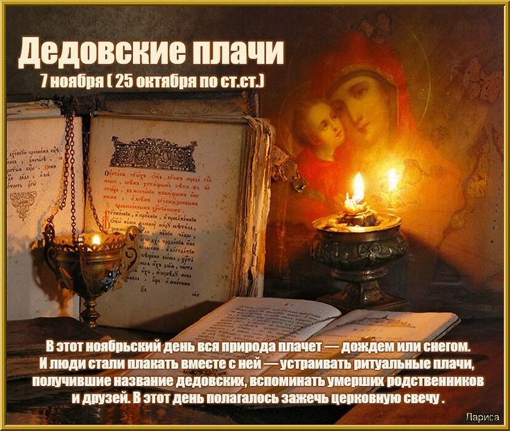 7 ноября вся природа плачет — дождем или снегом. И люди стали плакать вместе с ней — устраивать ритуальные плачи, получившие название дедовских, вспоминать умерших родственников и друзей. Открытки на Дедовские плачи.