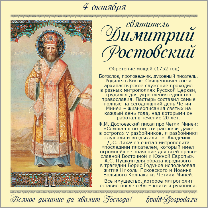 Желаю мира в семье, здоровья близким и радости в душе. Открытки на День памяти Святителя Димитрия Митрополита Ростовского!