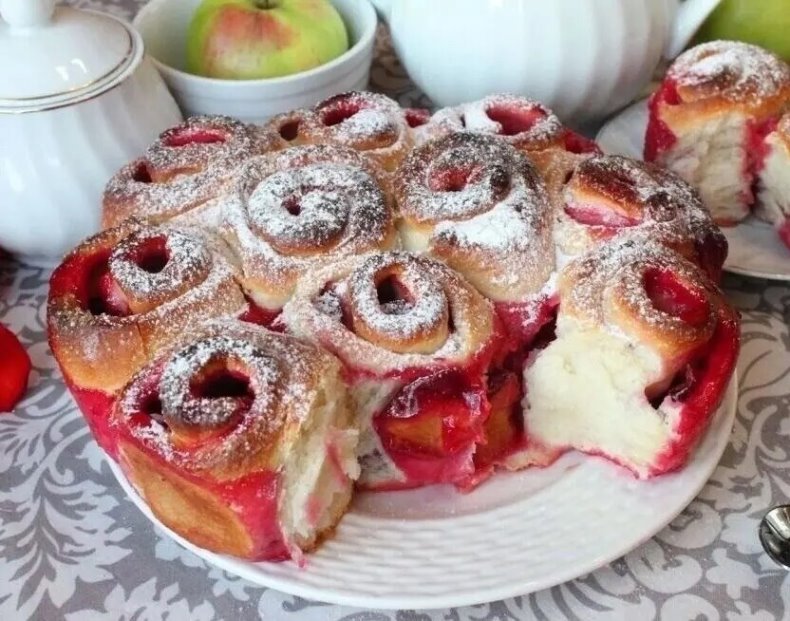 Сливовый пирог "Розочки" Мука 360 г Вода 200 мл Сахар 80 г Сухие дрожжи 1 ч.л Соль 1 щепотка Ванильный сахар с корицей 1/2 ч.л Растительное масло 60 мл Сливы 1/2 кг Сахарная пудра 1,5 ст.л Коричневый сахар 60 г