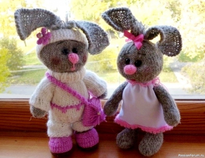 Зайки спицами. Описание | Вязаные игрушки. Мастер-классы, схемы, описание. Высота 13 см без ушей спицы№2, нитки – шерсть из старых клубочков. Пр. – прибавка, из одной петли вывязываем две (за заднюю и за переднюю дольки) Ноги, туловище, голова вяжутся одной деталью. Нога 1р.- пр., 6л., пр. ×3, 5л., пр. (21) 2р. – изн. 3р. – пр.×2, 7л., пр.×3, 7л., пр.×2...