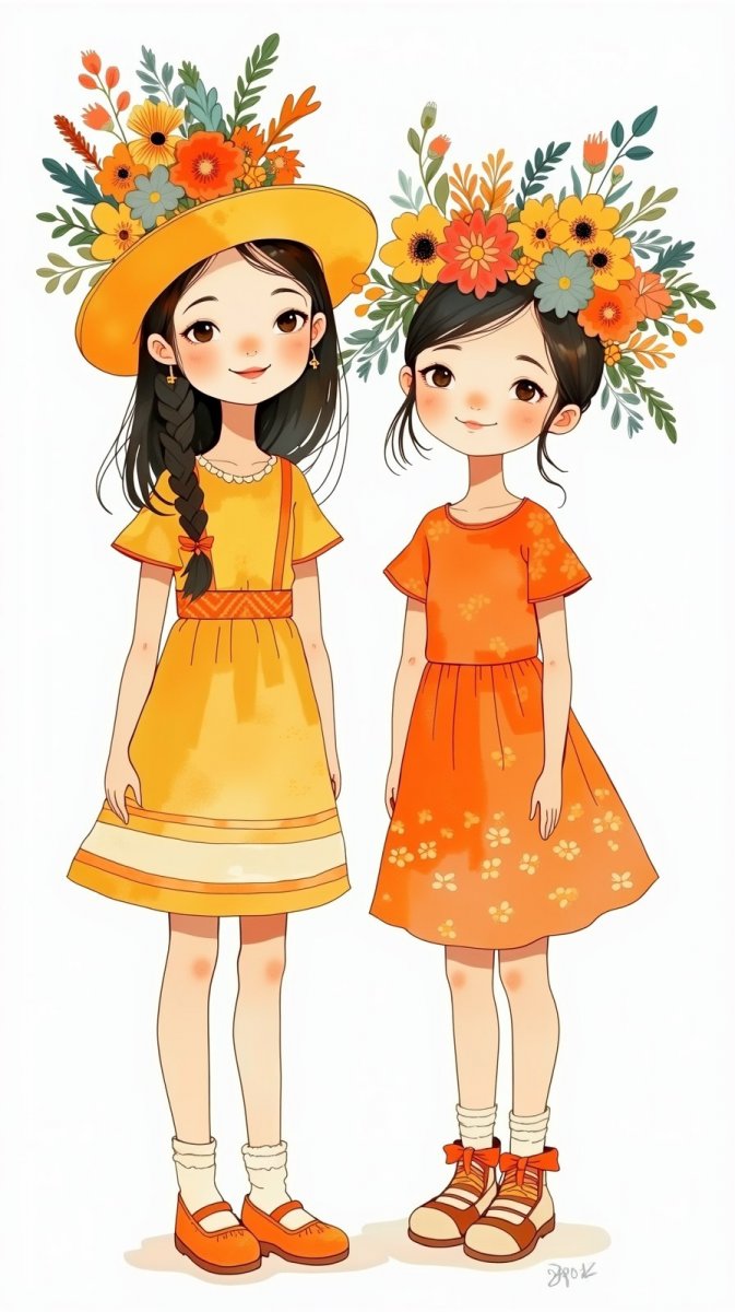 Две улыбчивые девочки в ярких нарядах и цветочном головном уборе против белого фона. Нейросеть Flux 1 - Flux.1 примеры промтов - Форум ИИ о нейросетях - Yes Ai