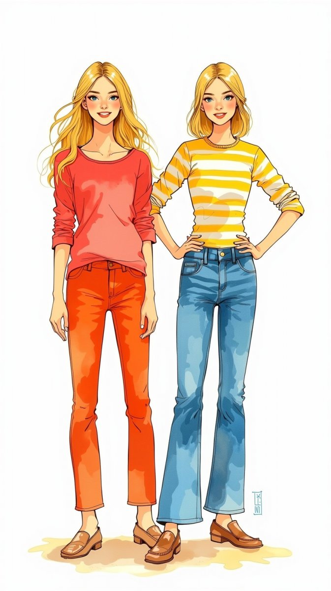 Две девушки в джинсах и ярких топах смотрят на зрителя. Генерация из нейросети Flux Ai - Flux.1 примеры промтов - Форум ИИ о нейросетях - Yes Ai