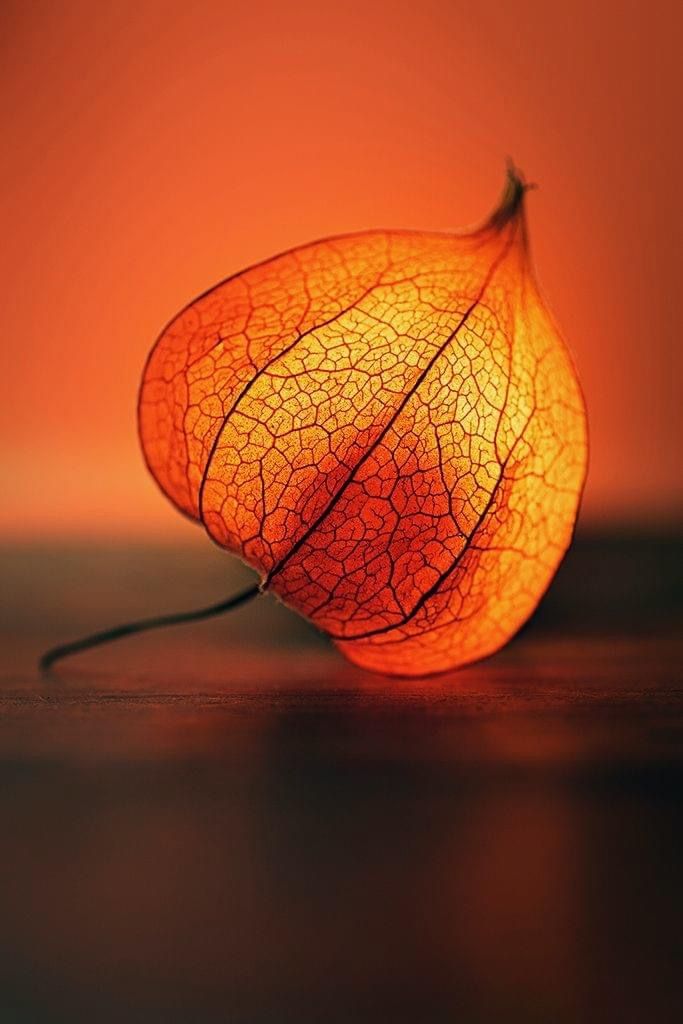 a close up of a leaf on a table with an orange light in the background