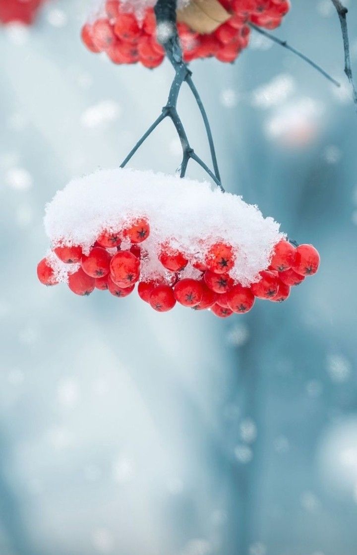 red berries are hanging from a branch covered in snow