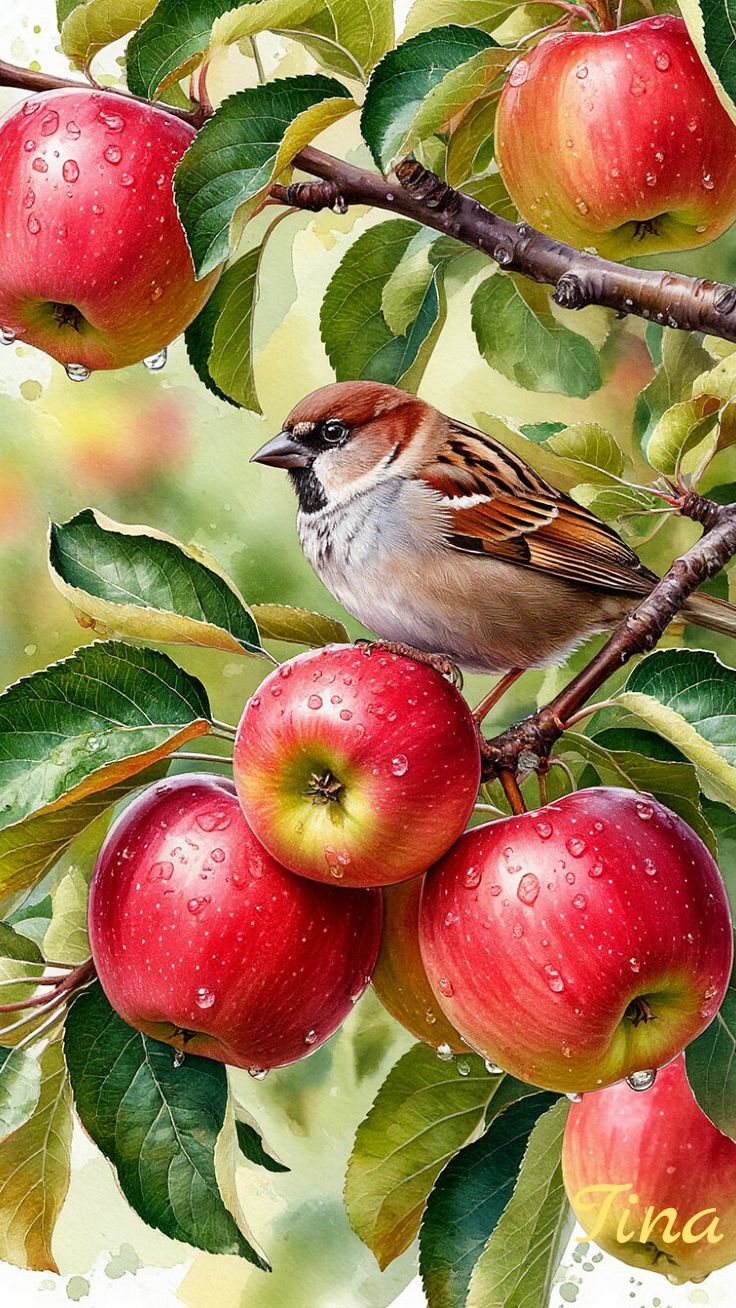 a bird sitting on top of an apple tree filled with ripe red apples and green leaves