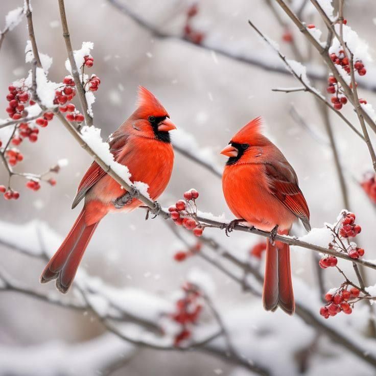 two red birds sitting on top of a tree branch with berries in the foreground