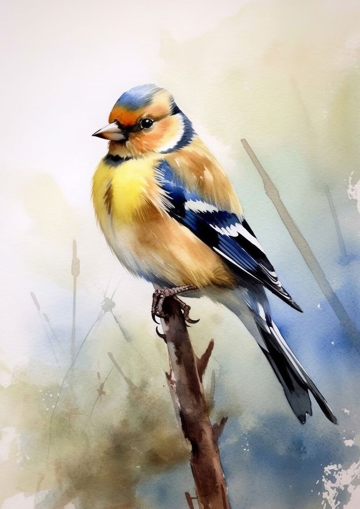 a bird sitting on top of a tree branch in front of watercolor painting background