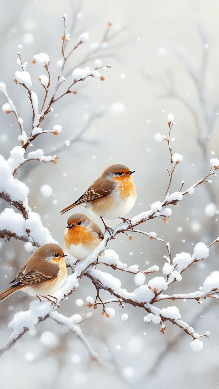 two birds sitting on top of a tree branch covered in snow