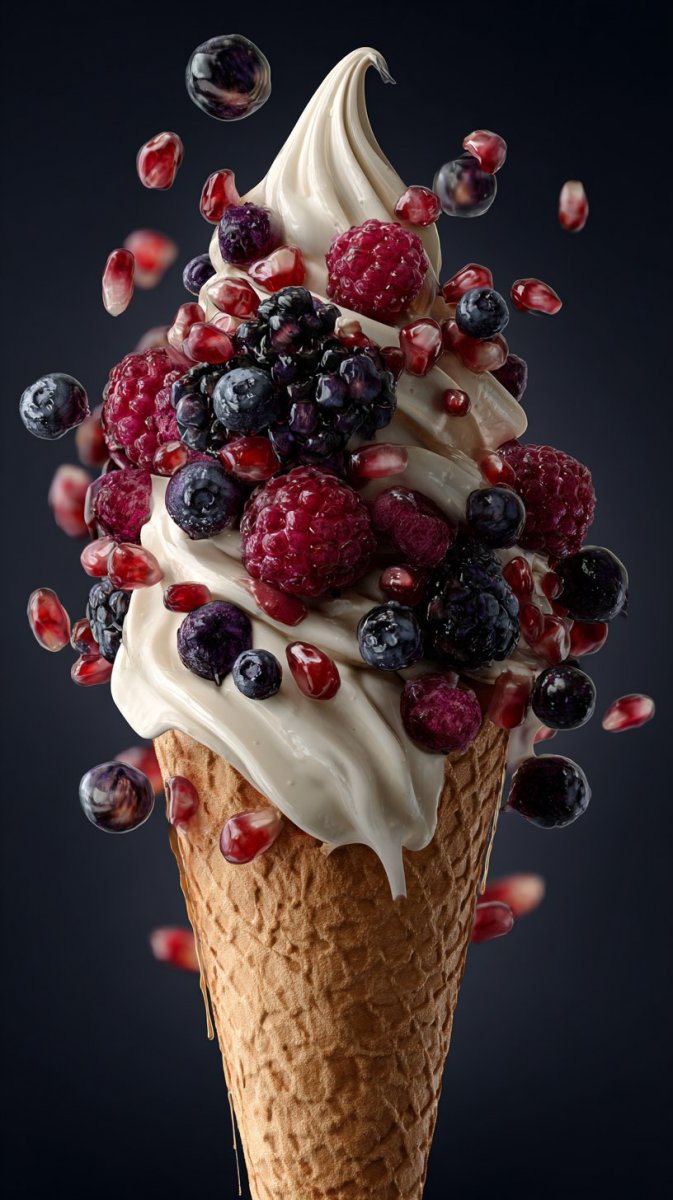 Яркий рожок с мороженым и свежими ягодами в фотореалистичном исполнении. Изображение из нейронной сети Midjourney - Midjourney примеры промтов - Форум ИИ о нейросетях - Yes Ai