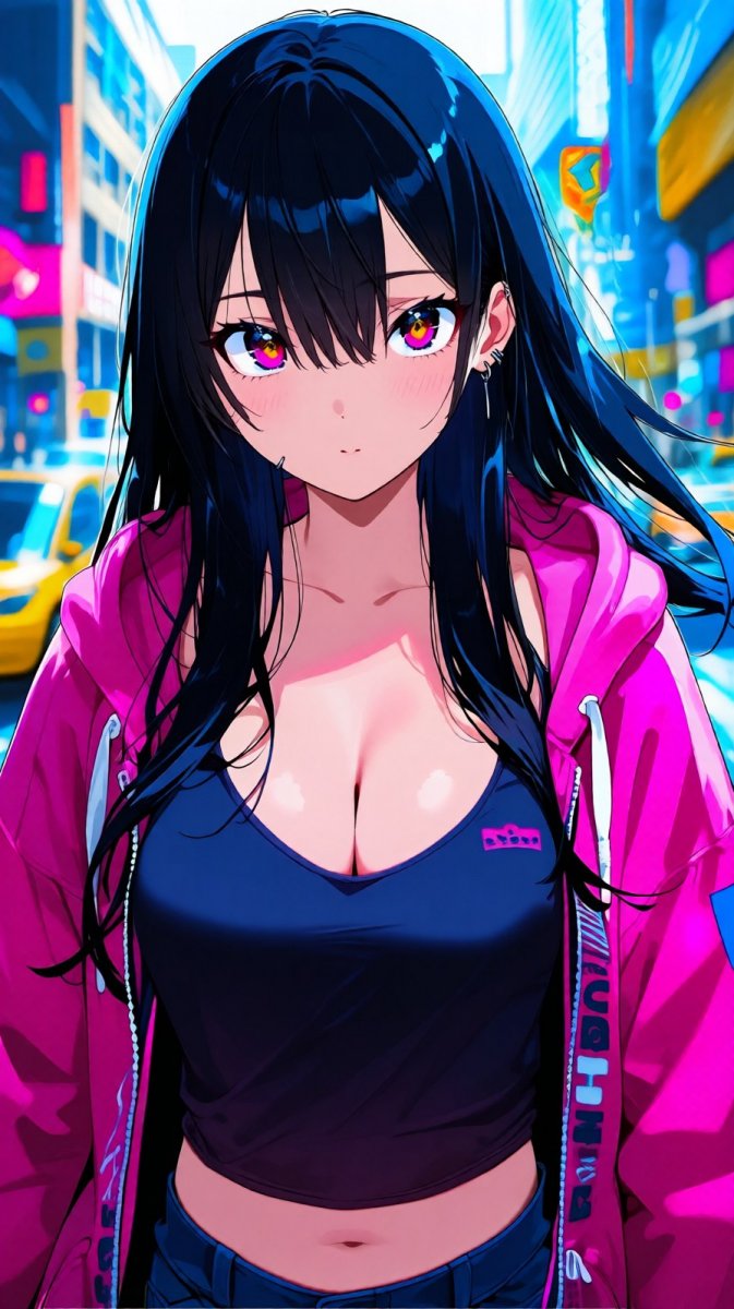 Яркая девушка в городском стиле с пронзительным взглядом и длинными черными волосами – иллюстрация для аниме. Картинка из нейросети Qwen - Qwen Images примеры промтов - Форум ИИ о нейросетях - Yes Ai