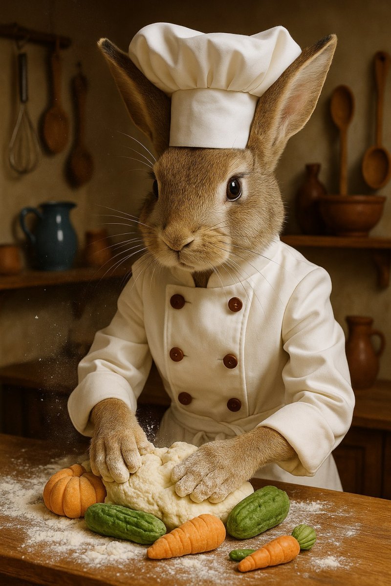 Забавный пекарь-кролик и овощное тесто в уютной кухне. Изображение из нейронной сети Sora Images - Sora Images примеры промтов - Форум ИИ о нейросетях - Yes Ai