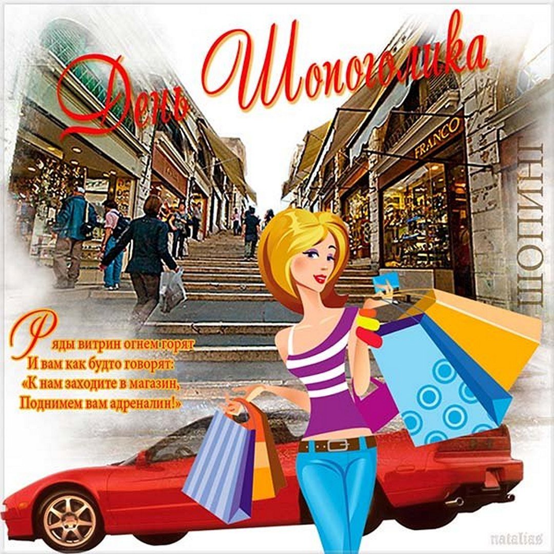 Всех, кто бег по магазинамПревращает в допинг,Поздравляю от души,Славим нынче шопинг. Открытки на День шопинга!