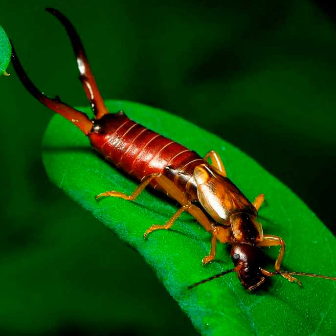 Вредитель комнатных растений Уховертка. Это садовый и домашний вредитель с темно-коричневым тельцем и двумя клещевидными придатками. Это насекомое трудно обнаружить на комнатных растениях, потому что днем оно прячется, а по ночам поедает листья и лепестки, так что на листьях образуются дырочки, иногда вплоть до полного исчезновения ткани листа.