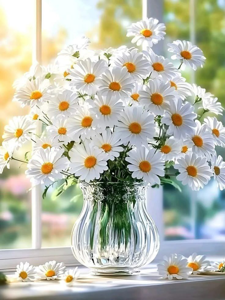 a vase filled with white daisies sitting on top of a window sill