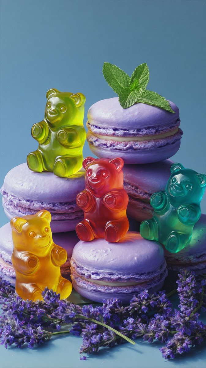 Яркие мармеладные мишки и фиолетовые макаруны в мягком свете. Изображение из нейронной сети Миджорни - Midjourney примеры промтов - Форум ИИ о нейросетях - Yes Ai