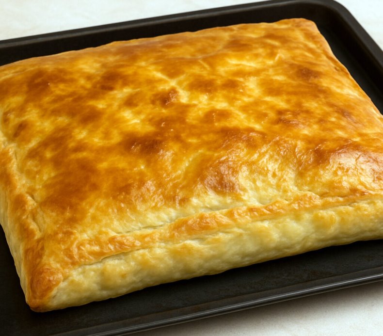 Большой домашний пирог с мясной начинкой, запечённый на противне Этот пирог получается большим, сочным и мягким, а золотистая корочка скрывает ароматную мясную начинку, приготовленную по-домашнему. Что понадобится Тесто дрожжевое или слоёное — 700–900 г Фарш мясной — 600–700 г Лук — 2–3 средние головки Картофель — 2 штуки по желанию Соль и чёрный перец — по вкусу Масло растительное — 2 столовые ложки Яйцо для смазки — 1 штука