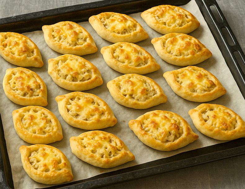 Лодочки с курицей и сыромМягкие лодочки с золотистой корочкой готовятся из простого теста и сочной начинки из курицы и овощей.