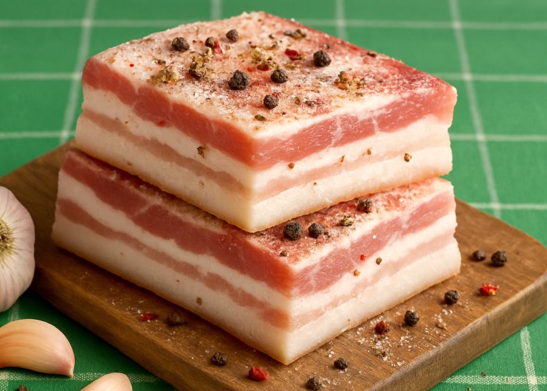 Нежное домашнее сало сухого посола с чесноком и специями Такое сало получается мягкое, ароматное и отлично хранится, а вкус раскрывается с каждым днём всё ярче, делая ломтик буквально тающим во рту. Что потребуется свежий шпик с мясными прослойками — около 1 кг соль крупная — 4 ст. л. без горки чеснок — 5–7 зубчиков смесь перцев грубого помола — 1 ч. л. лавровый лист — 3–4 шт. паприка или хлопья острого перца — по вкусу