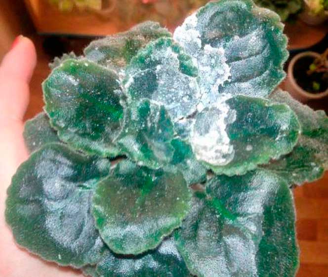 Болезнь комнатных растений Мучнистая роса. Грибковое заболевание, проявляется в виде белого мучнистого налета на листьях. В отличие от серой гнили, заболевание редкое и не очень сильно поражает растение, но снижает его декоративность и способно распространиться на стебли и цветки.