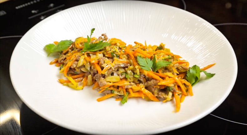 Морковь нарезаем тонкой соломкой, лук — кубиком, мясо — небольшими кусочками. Для салата лучше брать мягкую говя...
