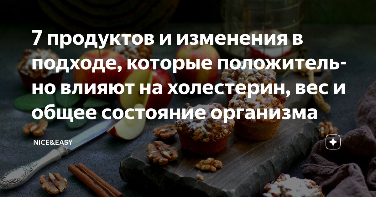 7 продуктов и изменения в подходе, которые положительно влияют на холестерин, вес и общее состояние организма Статья автора «Nice&Easy» в Дзене ✍: Всем привет! Сегодня у нас снова непростая тема.