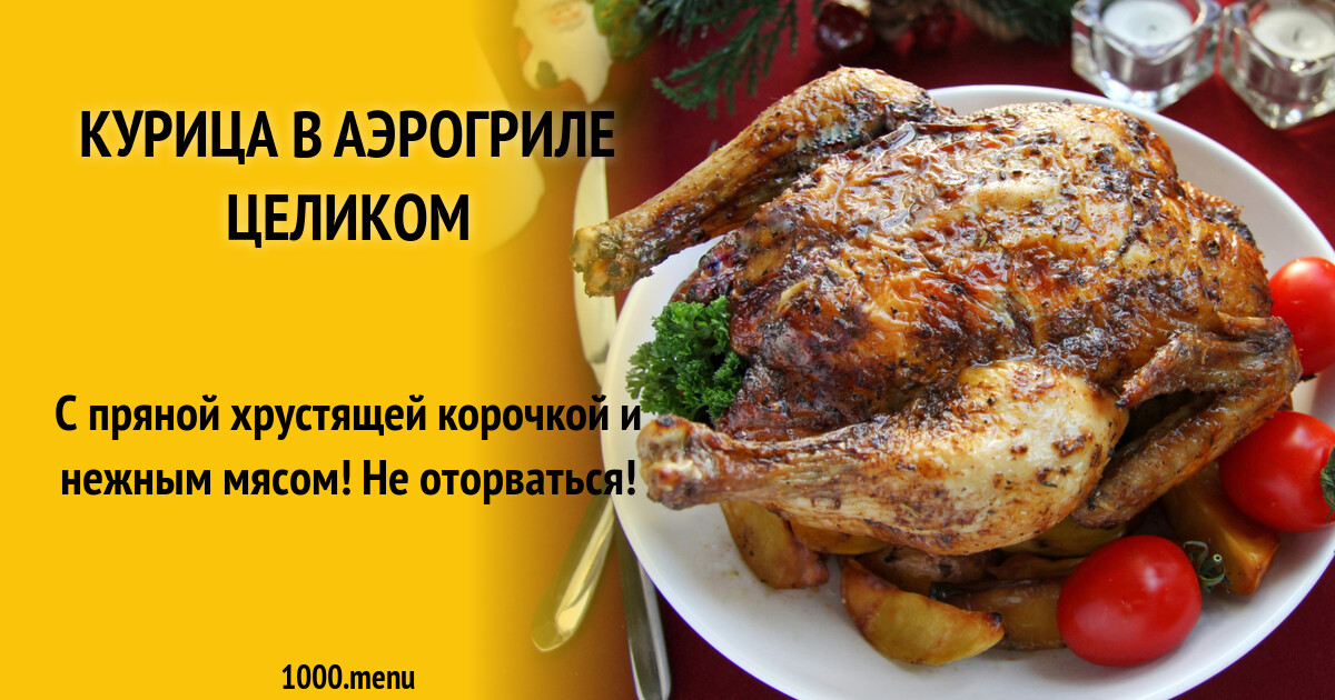 - Шаг 1: Как запечь курица в аэрогриле целиком с хрустящей корочкой? Подготовьте необходимые ингредиенты. Курочку лучше брать среднего размера, весом примерно 1.3-1.5 килограмма. Приготовление курицы стоит начать с подготовки маринада. Для этого нужно взять растительное масло и добавить в него сушёные травы: орегано, розмарин и базилик.Шаг 2: В ступке измельчите кумин (зиру) и три соцветия душистой гвоздики.Шаг 3: Отправьте измельченные кумин и гвоздику в масло. Всыпьте паприку и острый молотый перец.Шаг 4: Добавьте в масло к остальным специям сушёный чеснок и щепотку хмели-сунели. Добавьте соль по вкусу. Перемешайте маринад до однородности.Шаг 5: Курицу хорошо вымойте (в том числе и внутри). Удалите гузку (хвостик) и лишний жир. Тщательно натрите курицу маринадом снаружи и внутри. Для этого понадобится около трёх столовых ложек. Остальной маринад потребуется в дальнейшем при запекании. Курицу уберите в холодильник минимум на два часа для маринования. Шаг 6: По истечении этого времени достаньте курицу из холодильника. Положите под кожу грудки тонко нарезанные кусочки сливочного масла. Это позволит сохранить грудку сочной при выпекании. Будьте аккуратны, чтобы не повредить кожу. Сливочное масло не должно быть слишком мягким, чтобы оно не успело растаять в руках.Шаг 7: Курицу переложите в аэрогриль на спинку на самую нижнюю решётку.Шаг 8: Перед запеканием я советую сделать небольшие надрезы в коже чуть выше голеней с обеих сторон.Шаг 9: Закрепите в полученных кармашках крылья. Так они будут защищены от подгорания. Запекайте курицу при температуре 150 градусов на среднем обдуве в течение 1 часа. Несколько раз полейте курицу маринадом во время приготовления. Затем переверните птицу на грудку и запекайте спинку в течение 45 минут при той же температуре. Спинку также периодически поливайте оставшимся маринадом.