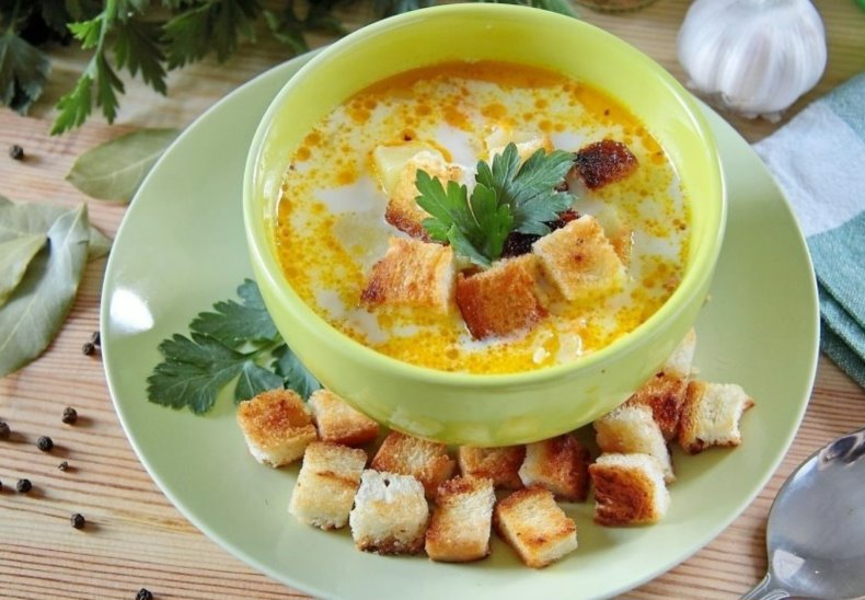 СУП С КУРИЦЕЙ, РИСОМ И ПЛАВЛЕНЫМ СЫРОМ ИНГРЕДИЕНТЫ: - Курица — 200 Грамм - Картофель — 3-4 Штук - Рис — 80 Грамм - Морковь — 1 Штука - Лук — 1 Штука - Сыр плавленый — 200 Грамм - Хлеб — 4 Ломтика - Вода — 1,5 Литра - Соль — По вкусу - Растительное масло — По вкусу