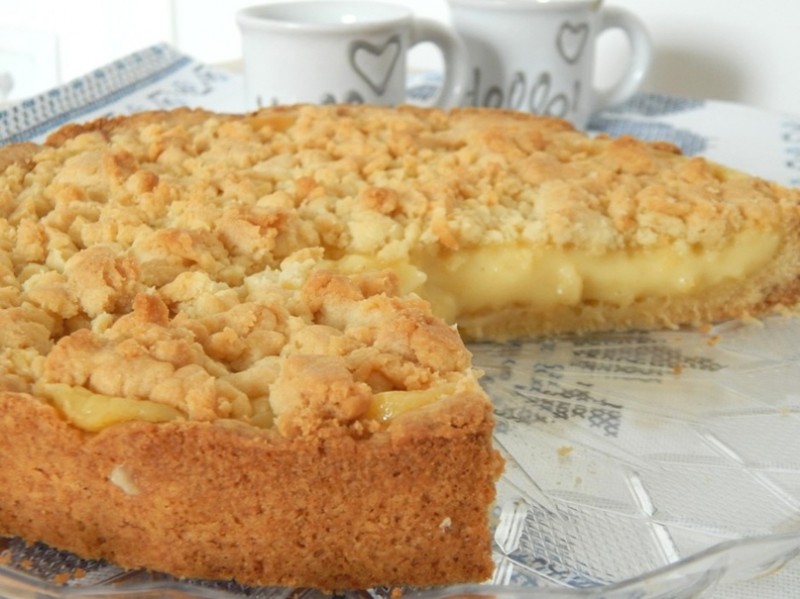 Песочный пирог с кремом Ингредиенты:Мука — 300 гМасло сливочное — 150 гСахар — 90 гЖелток — 1 шт.Разрыхлитель — 1 ч. л.Крем:Мука — 40 гСахар — 140 гЖелтки — 3 шт.Молоко — 300 млСливки — 200 млПриготовление: Для крема желтки, сахар и муку хорошо взбить....