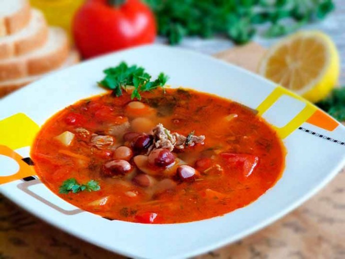 Томатный суп с фасолью Совсем несложный в приготовлении, этот суп с легкостью заменит полноценный обед. Он очень сытный благодаря фасоли! Ингредиенты: Вода - 2 л. Фасоль консервированная - 200 гр. Говядина - 300 гр. Картофель (крупный) - 1 шт. Лук репчатый (средний) - 1...