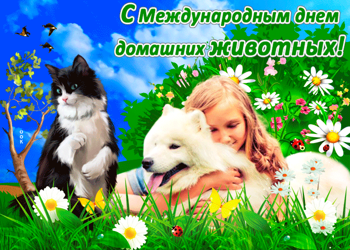 С днем домашних животных! Желаю вашему питомцу мягкой лежанки, полной миски и ежедневных поводов для радости. Открытки на День домашних животных!